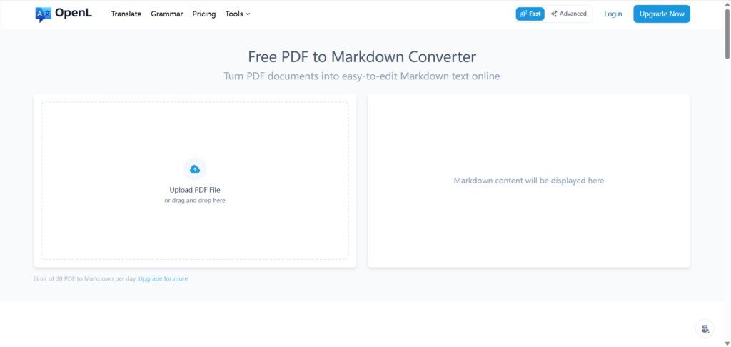 OpenL is one of the lesser-known PDF to MD tools, but it earns its place here thanks to its simplicity and speed. It’s not fancy—but it works.